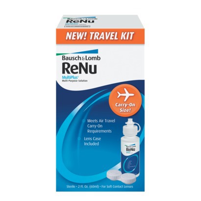 OPTI-FREE® PureMoist® Contact Lens Solution available in 2-oz and 4-oz bottle, Systane single use vials, Boston Travel pack, Bausch & Lomb travel kit etc