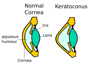 Normal corneas have cross-links between the collagen fibers that keep them strong and able to retain their normal shape. With keratoconus and related disorders, the cornea is weak with too few cross-links or support beams. This weakening allows the cornea to bulge outwards.